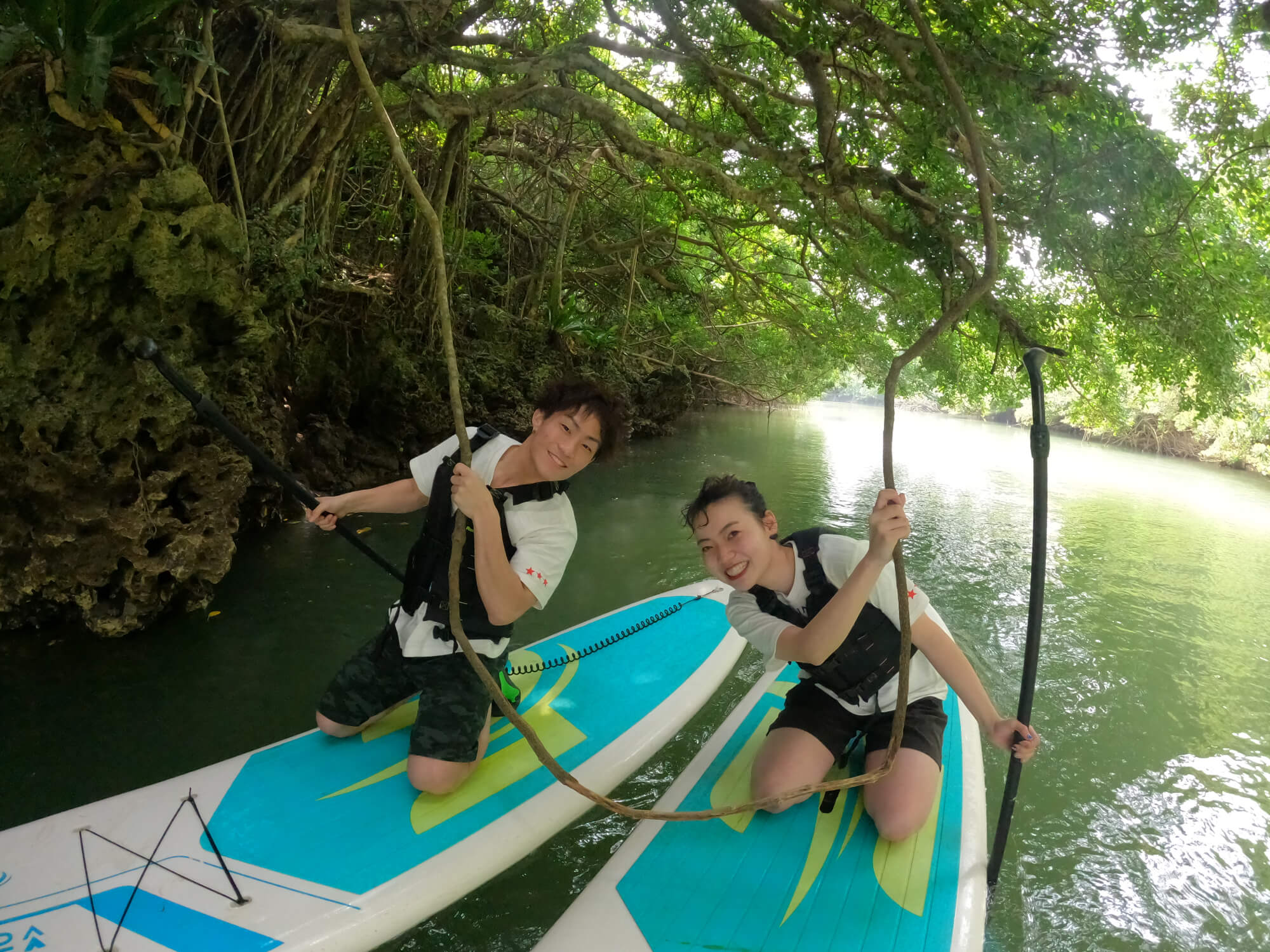 冬場の石垣島は、強く吹く北風の影響でSUPツアーが催行中止となることがしばしばありますが、吹通川のようにマングローブで風が遮られるような自然の風防ポイントは、風の影響を受けることなく、安心してツアーに参加できます。