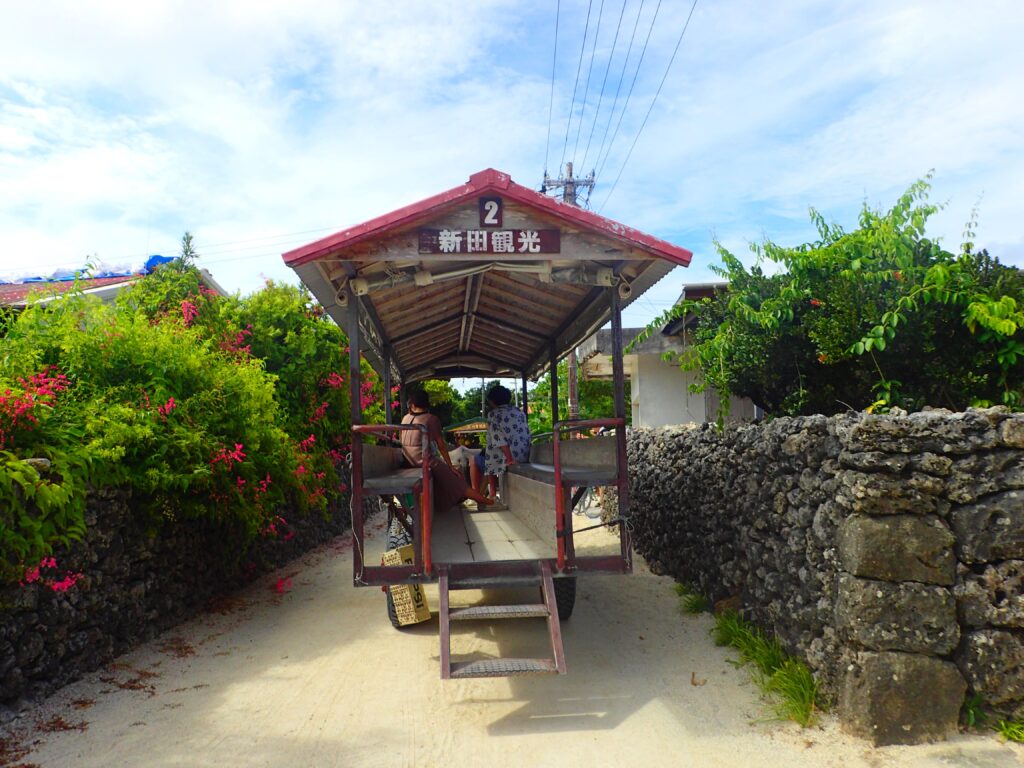 代表的な竹富島の観光サービス「水牛車」のようす