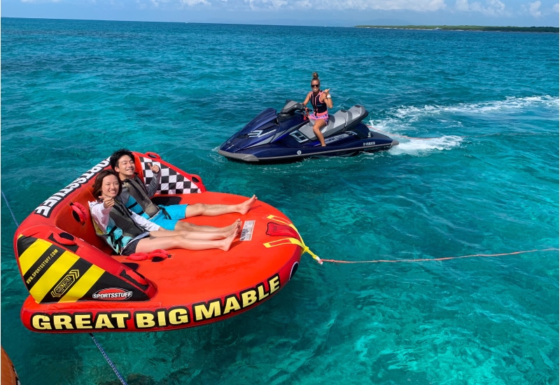 ポイント到着!静かな場所を求めて移動していますのでご想像以上に船が揺れないと思います!たくさんのマリンスポーツをご用意していますので、思う存分遊びましょう!当日のご利用人数に応じて、バナナボートなどのチューブを引っ張るジェットスキーの台数を調整していますので、思い切り楽しめます!後半バテてしまう方も続出なので、休憩を取りながらお楽しみください!